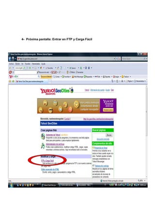 Este documento proporciona instrucciones en 9 pasos para subir archivos a un servidor utilizando FTP. Primero se debe crear una cuenta en Yahoo y luego iniciar sesión en Geocities para acceder a FTP. Luego, los archivos pueden subirse individualmente o mediante la configuración de un programa como Filezilla, ingresando los detalles de la cuenta y conectándose rápidamente al servidor para transferir archivos arrastrándolos o seleccionando subir/bajar.