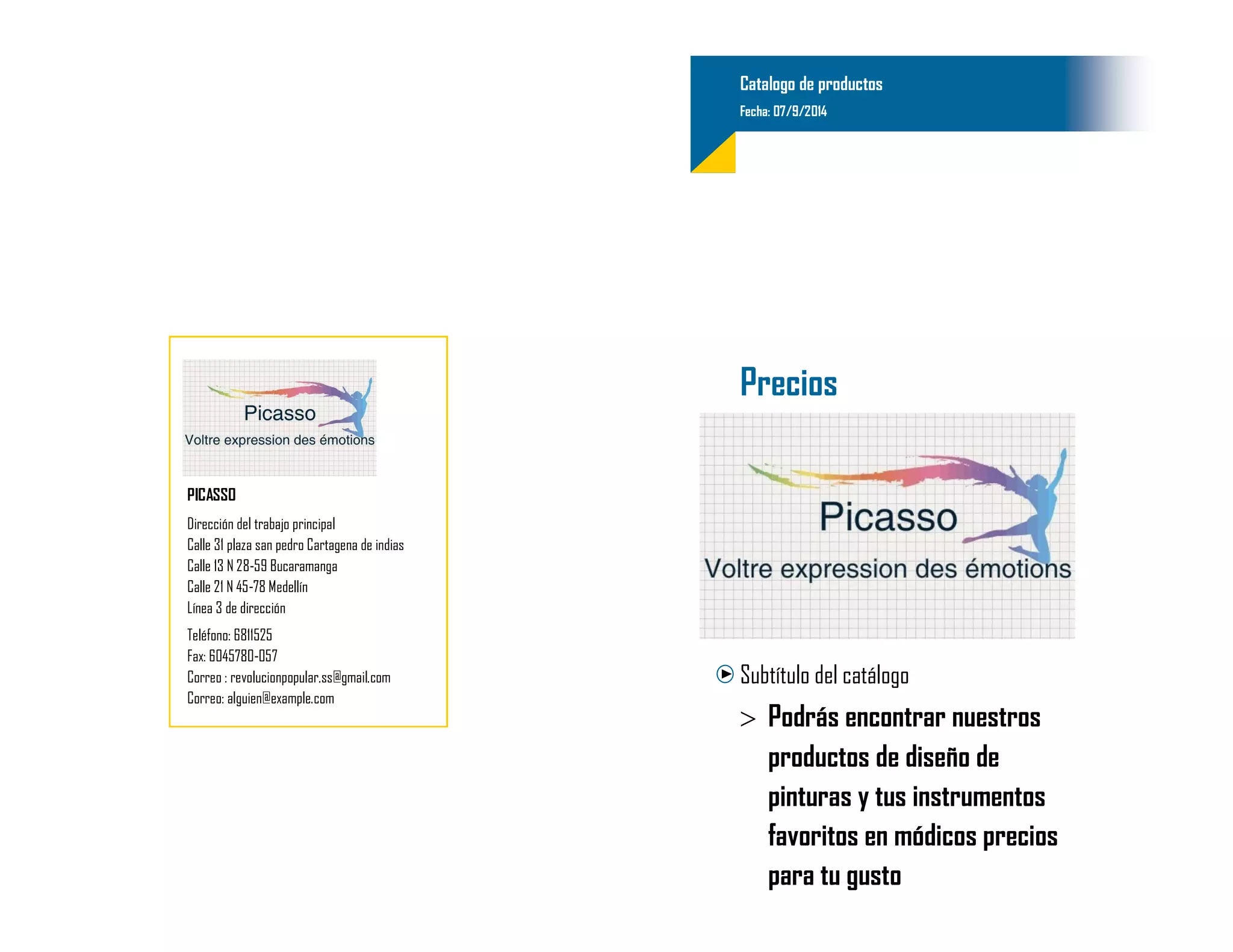 Este documento es un catálogo de productos musicales que incluye información de contacto, direcciones, instrumentos y accesorios musicales con sus precios y números de pedido. El catálogo contiene una variedad de instrumentos como guitarras, teclados, instrumentos de viento, percusión, entre otros. También presenta secciones para pinturas, esculturas, cuadros y nuevos productos.