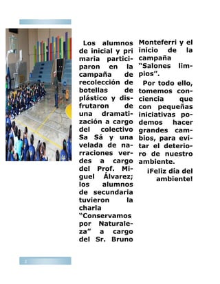 El documento es un boletín informativo de una organización que celebra el Día Mundial del Medio Ambiente. Los estudiantes participaron en actividades como la recolección de botellas plásticas y charlas sobre conservación ambiental. El boletín contiene varios artículos cortos sobre temas ambientales y una sección de puntos de interés. Alienta a los lectores a realizar pequeñas acciones que pueden generar grandes cambios positivos para el medio ambiente.