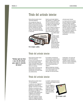 El documento presenta un boletín interno de una escuela llamada Liceo Atenea. El boletín incluye varios artículos cortos sobre temas como las actividades del mes de marzo y recomendaciones para los nuevos estudiantes. Además, ofrece consejos sobre cómo crear un boletín informativo efectivo.