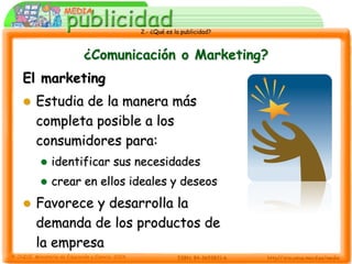 La publicidad es una herramienta de comunicación al servicio del marketing. El marketing estudia a los consumidores para identificar sus necesidades y crear demanda de productos. La publicidad es una forma en que las empresas se comunican con el mercado para apoyar sus objetivos de marketing. Una marca se construye asociando un valor al producto a través de su nombre, logotipo e imagen para que los consumidores la reconozcan.