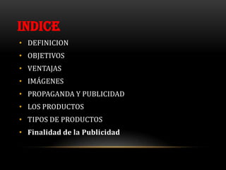 Este documento define la publicidad y sus objetivos, y describe varios tipos de productos publicitarios. Explica que la publicidad busca influir en las actitudes y comportamientos de las personas utilizando imágenes y otras técnicas, mientras que la propaganda tiene fines ideológicos o culturales. También distingue entre productos de uso diario, artículos de alto precio y productos para demostrar la personalidad.