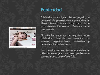 La publicidad es cualquier forma pagada de presentar y promover ideas, bienes o servicios por parte de un patrocinador para crear preferencia por una marca. No solo las empresas hacen publicidad, también organizaciones sin fines de lucro y el gobierno. Las empresas grandes tienen departamentos de publicidad propios, mientras que las pequeñas trabajan con agencias de publicidad. La publicidad toma diferentes formas como informativa, comparativa o persuasiva, y se evalúa su efectividad en términos de comunicación y ventas.