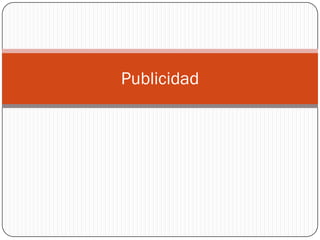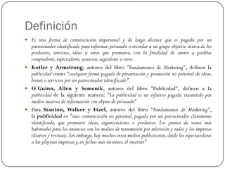 El documento define la publicidad y describe sus diferentes tipos, incluyendo la publicidad de marca, detallista, de respuesta directa, B2B, institucional, sin fines de lucro y de servicio público. La publicidad es una forma de comunicación pagada que promueve productos, servicios e ideas a grupos objetivos a través de medios masivos para informar, persuadir o recordar con el fin de atraer compradores.