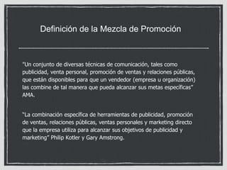 El documento define la mezcla de promoción como el conjunto de técnicas de comunicación como publicidad, ventas personales, promoción de ventas y relaciones públicas que una empresa combina para alcanzar sus objetivos. Luego enumera las herramientas de la mezcla de promoción e incluye definiciones breves de publicidad, ventas personales, promoción de ventas, relaciones públicas, marketing directo y merchandising. Finalmente, cita a Philip Kotler señalando que las empresas deben vigilar el ciclo de vida del mercado y no solo