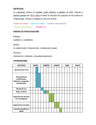 Este documento describe un estudio sobre la efectividad de la publicidad de KFC en San Luis Potosí, México. El estudio utilizará enfoques cualitativos y cuantitativos, incluyendo observaciones, entrevistas y encuestas, para evaluar cómo los diferentes medios publicitarios de KFC influyen en los clientes y su decisión de comprar en ciertas ubicaciones. La hipótesis es que la publicidad urbana como volantes, espectaculares y súper gráficos tiene más impacto en clientes jóvenes de 16-21 años