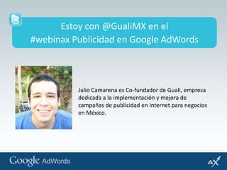 Este documento proporciona información sobre la publicidad en Google AdWords. Explica que AdWords permite anuncios flexibles y medibles dirigidos a palabras clave. Cubre temas como la configuración de cuentas, palabras clave, anuncios, optimización mediante el seguimiento de métricas como conversiones y tasas de clic. También ofrece consejos como mejorar las páginas de destino y estructurar efectivamente los anuncios.