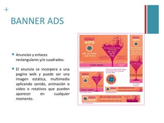 Este documento describe diferentes tipos de publicidad en Internet, incluyendo banners, botones publicitarios, anuncios de texto, publicidad de Google AdSense y AdWords, intersticiales, ventanas emergentes, publicidad en formato HTML, híbrida, de patrocinadores, enriquecida con Flash/Shockwave, en redes sociales como Facebook y YouTube. Explica características como tamaños, ubicaciones y formatos de cada tipo de publicidad, así como cómo generan ingresos para los sitios web.