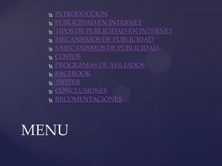 Este documento resume los diferentes tipos y mecanismos de publicidad en Internet, incluyendo banners, posicionamiento, correo electrónico, anuncios destacados, newsletters y sitios web. Explica los costos comunes como CPM, CPC, CPL y CPA, así como programas de afiliados, publicidad en Facebook y Twitter. Concluye que la publicidad en Internet es importante para las empresas y recomienda investigar opciones de publicidad en línea que se ajusten al presupuesto.