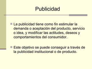 La publicidad en Internet tiene como objetivo modificar las actitudes y comportamientos de los consumidores para estimular la demanda de productos y servicios. Ofrece ventajas como segmentación del público, alcance geográfico amplio y bajos costos. Los tipos de publicidad en Internet incluyen banners, ventanas emergentes, redes sociales y publicidad de pago por clic en motores de búsqueda. Los mecanismos utilizados son banners, posicionamiento, email marketing, avisos destacados y newsletters, entre otros.