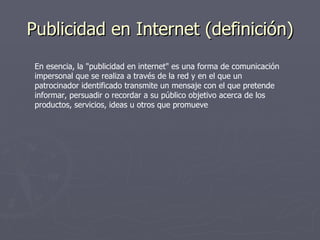 La publicidad en Internet es una forma de comunicación impersonal a través de la red donde un patrocinador identificado transmite un mensaje para informar, persuadir o recordar al público objetivo acerca de sus productos o servicios. Los medios de publicidad en Internet incluyen buscadores, directorios, programas de anuncios, páginas que ofrecen bloques de píxeles, sitios de intercambio de banners y boletines electrónicos. Con el crecimiento de Internet como un medio masivo de comunicación, la publicidad en Internet también evolucionará y dinamizará