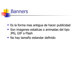 Los tipos principales de publicidad en Internet incluyen banners, ventanas emergentes, publicidad en Google y redes sociales, anuncios clasificados gratuitos, correo electrónico y videos. La publicidad en redes sociales es uno de los fenómenos de mayor crecimiento debido a los servicios gratuitos que ofrecen, mientras que los anuncios clasificados gratuitos se publican en portales en categorías relevantes pero solo están disponibles por un tiempo limitado. La publicidad por video en sitios como YouTube es uno de los mejores medios para captar la atenc