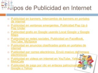 Este documento describe varios tipos de publicidad en Internet, incluyendo banners, ventanas emergentes, publicidad gratuita en Google, publicidad en redes sociales, anuncios clasificados, correo electrónico y videos. Explica las ventajas de cada método, como costos bajos, gran alcance de audiencia y métricas para medir el rendimiento. La publicidad en Internet ofrece muchas opciones a bajo costo para que empresas promocionen sus productos y servicios.
