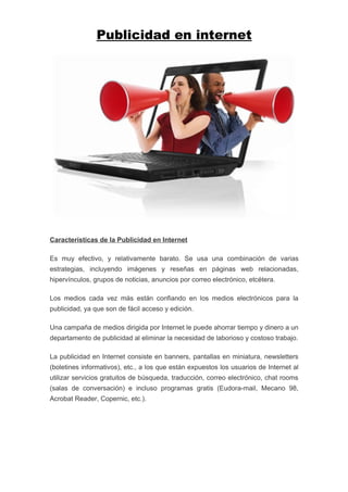 La publicidad en internet es efectiva y relativamente barata, utilizando una combinación de imágenes, enlaces y anuncios en páginas web, correos electrónicos y grupos de noticias. Ofrece ventajas como bajos costos, mayor audiencia a nivel mundial, y la capacidad de medir fácilmente los resultados, pero también tiene desventajas como la saturación de anuncios que evitan los usuarios y la dificultad de predecir qué páginas serán las mejores para cada producto.