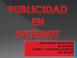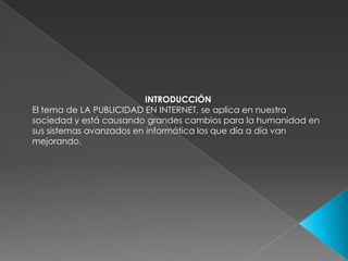 Este documento describe los diferentes tipos y formas de publicidad en Internet, incluyendo banners, blogs, RSS, código HTML, programas afiliados, software y redes sociales como Facebook y Twitter. Explica que la publicidad en Internet es efectiva y barata, dirigiéndose específicamente al público objetivo. También discute los costos y beneficios de la publicidad en Internet para las empresas.