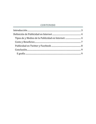 Este documento resume los diferentes tipos y medios de publicidad en Internet, incluyendo buscadores, directorios, programas de anuncios, páginas de píxeles, sitios de intercambio de banners, boletines electrónicos, espacios en páginas web, y anuncios clasificados. También discute los costos y beneficios de la publicidad en YouTube y las redes sociales como Twitter y Facebook, explicando cómo estas plataformas planean generar ingresos a través de mensajes patrocinados.