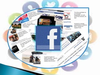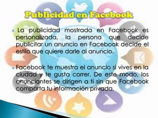 El documento describe cómo la publicidad en Facebook se personaliza según la ciudad y los intereses del usuario sin compartir su información privada. También explica que los seguidores en Facebook permiten a las empresas enviar mensajes y promociones relevantes a su público objetivo. Además, proporciona datos sobre el número de usuarios de diferentes medios como la radio, la televisión, Internet y Facebook.