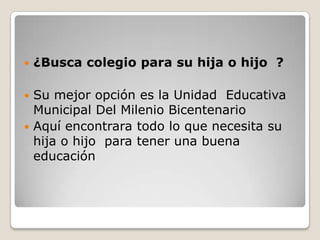La Unidad Educativa Municipal Del Milenio Bicentenario ofrece la mejor educación para los hijos, con docentes excelentes y tecnología avanzada, asegurando una educación de calidad y diversión en un ambiente seguro. Ubicada en Av. Maldonado y calle beaterio, es la mejor opción para el colegio.