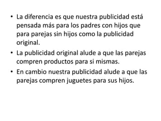 La publicidad original se dirige a parejas sin hijos para que compren productos para sí mismos, mientras que la nueva publicidad está dirigida a padres con hijos para que compren juguetes para sus hijos. La nueva publicidad se enfoca en familias en lugar de parejas sin hijos.
