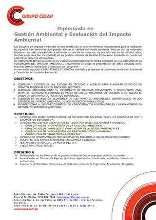 CESAP ofrece un diplomado en gestión ambiental y evaluación del impacto ambiental, diseñado para proporcionar las herramientas necesarias para la elaboración de estudios de impacto ambiental en diversos sectores. El programa incluye módulos sobre legislación ambiental, técnicas de evaluación de impactos, auditoría ambiental y participación ciudadana, y se ofrece en modalidades presencial, semipresencial y virtual, facilitando el acceso de profesionales del área. Al finalizar, los participantes recibirán certificaciones de instituciones reconocidas y tendrán acceso a materiales de estudio y apoyo académico.