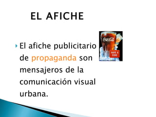 La publicidad es un conjunto de medios empleados para anunciar productos y divulgar noticias con el objetivo de influir en las personas y ofrecer soluciones a sus necesidades. El afiche publicitario es un mensaje visual que identifica claramente el producto a través de ilustraciones y texto breve. Los afiches cumplen funciones estéticas, educativas, de creación de deseos y propaganda, y ayudan a ambientar los lugares donde se ubican. La publicidad tiene objetivos comerciales, mientras que la propaganda busca manipular ideológicamente a trav