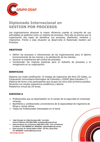 El documento presenta información sobre un diplomado internacional en gestión por procesos organizado por CESAP. El diplomado consta de cinco cursos especializados sobre estadística aplicada, herramientas para la gestión de calidad, control y mejora de procesos, impacto de las tecnologías de la información, y business process management. Se ofrecen diferentes modalidades como presencial, semipresencial, distancia y virtual. El diplomado busca que los participantes conozcan conceptos y herramientas para la identificación, diseño,