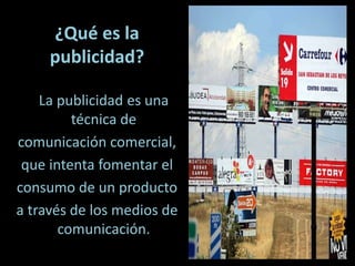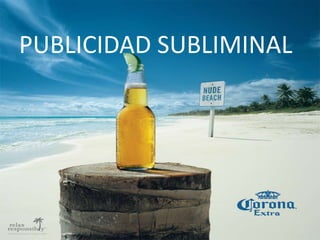 La publicidad subliminal se refiere al uso de estímulos en los medios de comunicación como la televisión, el cine y la radio que no son percibidos conscientemente pero influyen en la conducta con el fin de lograr objetivos comerciales. Se originó en 1957 cuando James Vicary presentó mensajes publicitarios de forma subliminal durante una película en un cine en Nueva Jersey, lo que aumentó significativamente las ventas de los productos mencionados. En conclusión, la publicidad subliminal puede ser buena para las estrategias de ventas pero mal