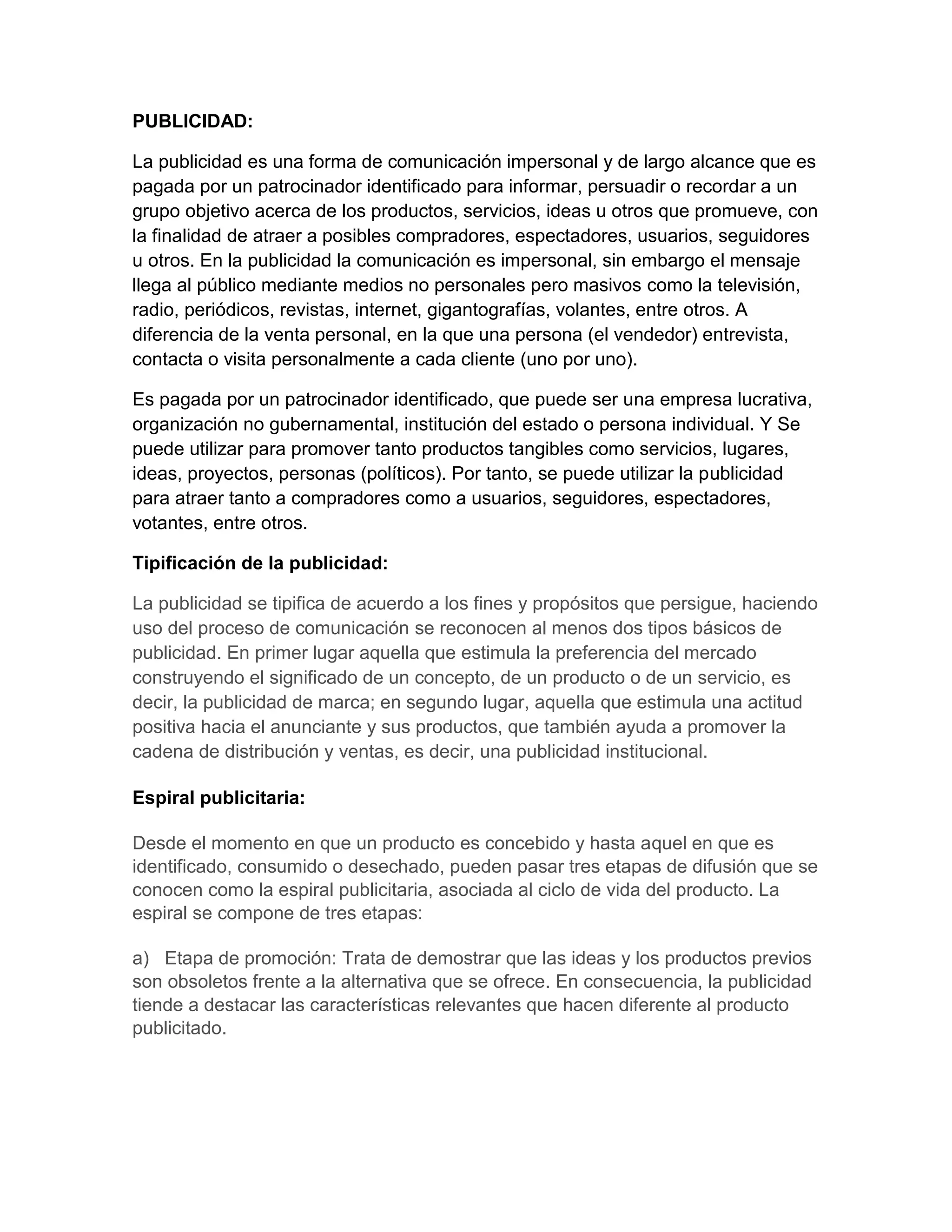 La publicidad es una forma de comunicación pagada que promueve productos, servicios u otras ideas a un público objetivo con el fin de atraer compradores u otros. La propaganda difunde ideas e información para inducir actitudes y acciones específicas con la intención de convencer a una audiencia. Ambas buscan influir en las opiniones de las personas, pero la publicidad lo hace con fines comerciales mientras que la propaganda puede tener fines políticos, religiosos u otros no comerciales.