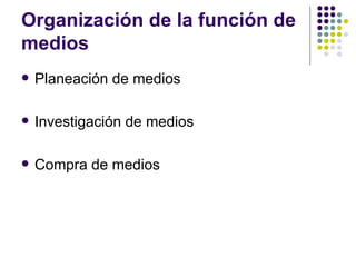 El documento habla sobre la estrategia de medios en la planificación de campañas publicitarias. Explica que la estrategia involucra la investigación, compra y optimización de medios a través de la segmentación, evaluación de pertinencia y afinidad. También cubre conceptos como convergencia, interactividad, centrales de medios y características clave como audiencia objetivo, alcance, frecuencia y presupuesto.