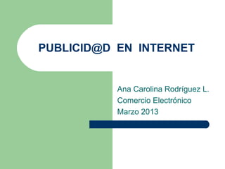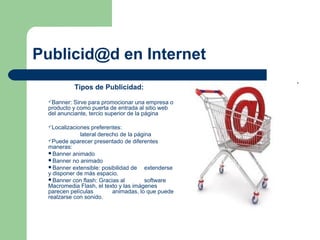 Este documento describe diferentes tipos de publicidad en Internet como banners, localizaciones preferentes y mecanismos utilizados como buscadores y directorios. También discute los costos y beneficios de la publicidad en Internet, incluyendo menores costos, mayor audiencia y determinación de necesidades. Además, menciona softwares para hacer publicidad por Internet y las opciones de publicidad a través de redes sociales como Facebook.