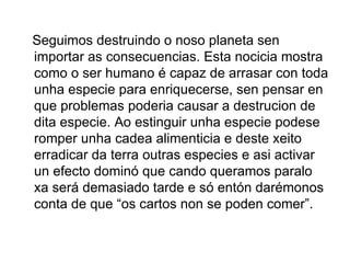 Las poblaciones de atún y caballa han disminuido un 60% en los últimos 60 años debido a la sobrepesca, lo que las ha llevado al borde de la sostenibilidad. El documento señala que el ser humano ha sido capaz de arrasar con especies enteras para enriquecerse sin pensar en las consecuencias, como romper cadenas alimenticias y erradicar otras especies en un efecto dominó que podría ser irreversible.