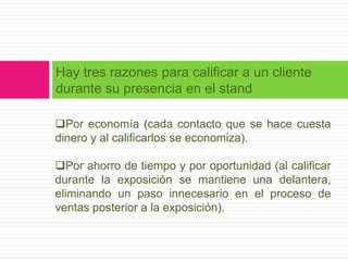 El documento proporciona información sobre la planificación y organización de ferias. Explica que es importante considerar la oferta y la demanda del público objetivo, y calificar a los clientes durante la feria para ahorrar tiempo y dinero. También destaca la importancia de organizar la feria como un evento empresarial coordinando con gremios, constituyendo un equipo dedicado, y eligiendo un recinto ferial adecuado con servicios e instalaciones necesarias. Además, cubre aspectos como stands, inscripción, reglamentos, y tipos de