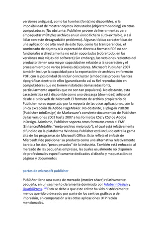 Microsoft Publisher es una aplicación de autoedición o diseño de páginas de Microsoft que se utiliza para crear publicaciones impresas como folletos, boletines y tarjetas. A diferencia de programas como Word que se centran en la composición de textos, Publisher se enfoca en el diseño y maquetación de páginas. Publisher tiene una cuota de mercado pequeña dominada por Adobe InDesign y QuarkXPress debido a que históricamente ha sido menos popular entre los centros de impresión. Las versiones recientes de Publisher incluyen mejoras como la capacidad de exportar