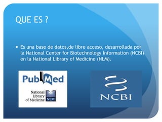 El documento presenta una guía sobre PubMed, una base de datos de libre acceso que ofrece más de 16 millones de referencias de artículos en ciencias de la salud. Se detalla cómo realizar búsquedas simples y avanzadas utilizando operadores booleanos, truncamiento y calificadores de campo. Además, se explican opciones para guardar y enviar citas seleccionadas, así como sus limitaciones de búsqueda por diferentes criterios.
