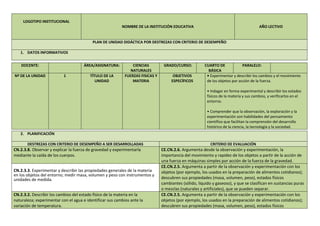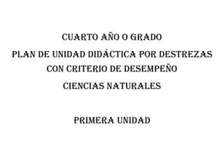 Este documento presenta el plan de una unidad didáctica sobre ciencias naturales para cuarto grado. La unidad se centra en las fuerzas físicas y la materia. Incluye objetivos específicos, destrezas que los estudiantes desarrollarán con criterios de desempeño, estrategias metodológicas, y adaptaciones curriculares para estudiantes con necesidades educativas especiales.