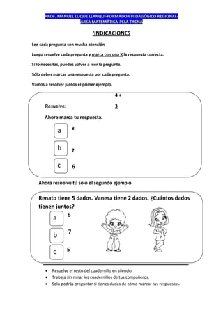 Este documento presenta un cuadernillo de ejercicios matemáticos para estudiantes de primaria con instrucciones para resolverlos. Contiene 21 preguntas de matemáticas con operaciones como suma, resta y conversión de unidades y decenas. El profesor Manuel Luque Llanqui proporciona este material didáctico para practicar conceptos numéricos básicos.