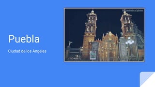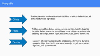 Puebla es una ciudad fundada en 1531 en México conocida como la "Ciudad de los Ángeles". Presenta un clima templado debido a su altitud y alberga una variedad de flora y fauna silvestre como magueyes, árboles frutales y animales como ardillas y coyotes. Tuvo un papel importante en la historia de México al derrotar a las fuerzas francesas en 1862 durante la intervención y al ser el lugar donde se inició el levantamiento contra el régimen porfirista en 1910.
