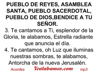 El documento es una oración de alabanza a Jesucristo en la que se le cantan y alaban sus diferentes roles y atributos como Hijo de Dios, Salvador, Luz, Mesías, Sacerdote, Cordero de Dios, Pastor y Juez. A lo largo de diecisiete estrofas se enumeran las diferentes formas en que Cristo es venerado y alabado.