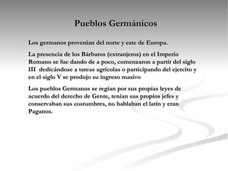 Los pueblos germánicos como los godos, francos y lombardos invadieron el Imperio Romano de Occidente entre los siglos III y V, estableciendo pequeños reinos. Los hunos empujaron a algunos germanos a invadir el imperio. En 476, los visigodos disolvieron definitivamente el imperio romano de occidente al proclamar a su rey como rey de Roma.