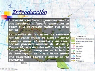 El documento resume la historia de varios pueblos bárbaros o germanos que invadieron el Imperio Romano entre los siglos III y V d.C., incluyendo los hunos, ostrogodos, visigodos, vándalos y francos. Describe el origen de cada pueblo, sus principales acciones como invasores de territorios romanos, y algunos eventos clave en la historia de cada uno. Finalmente incluye una sección de bibliografía con fuentes consultadas.