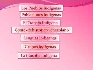Los pueblos indígenas que actualmente habitan en Venezuela descienden de los grupos que ya se encontraban en el territorio en el momento de la llegada de los colonizadores europeos. Estos pueblos se han mantenido relativamente aislados y han preservado en mayor o menor medida sus costumbres ancestrales. Cada pueblo ocupa un territorio sagrado que consideran les fue otorgado por los dioses. Existen más de 30 lenguas y culturas indígenas en Venezuela, aunque muchas lenguas se encuentran amenazadas o en pel