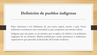 El documento describe la definición de los pueblos indígenas como comunidades que comparten una cultura y tienen tradiciones organizativas anteriores al estado moderno. Se expone la misión de fortalecer y desarrollar a estas comunidades en América Latina y el Caribe, así como el objetivo de apoyar su desarrollo sostenible y el reconocimiento de sus derechos. Además, menciona la conferencia mundial sobre los pueblos indígenas y la historia de la lucha por la tierra en Ecuador, donde existen 13 nacionalidades indígenas con sus propias lenguas y culturas.