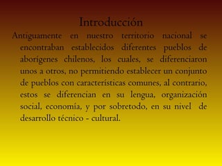Antes de la llegada de los españoles, el territorio chileno estaba habitado por diversos pueblos indígenas, incluyendo nómadas como los changos, aymaras y tehuelches, y sedentarios como los atacameños, diaguitas y mapuches. Los mapuches vivían entre los ríos Choapa y Reloncaví y practicaban la agricultura, caza y alfarería.