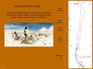 Antes de la llegada de los europeos, existían diversos pueblos originarios en el territorio de Chile, incluyendo los atacameños en el Norte Grande, los diaguitas en el Norte Semiárido, los mapuches en Chile Central-Sur, los tehuelches y selk'nam en el Extremo Sur, y los changos, kawashkar y yámanas en Tierra del Fuego. Cada uno se adaptó a su entorno desarrollando un estilo de vida, cultura y tecnologías únicas basadas en la agricultura, caza, re