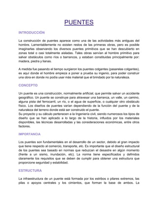 El documento describe la historia, tipos y características de los puentes. Explica que los puentes se han construido desde tiempos antiguos para salvar obstáculos y que existen diferentes tipos dependiendo del material y diseño. Luego describe algunos puentes notables en Ecuador como el Puente de Los Caras, el Puente de la Unidad Nacional y el Puente Majestuoso sobre el Río Napo.