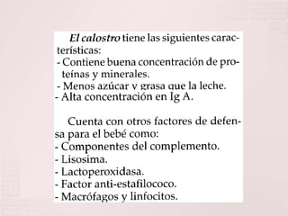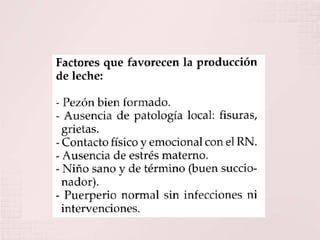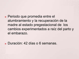 El puerperio normal dura 6 semanas y comprende la involución uterina, donde el útero disminuye de tamaño de 1000g a 50-100g. Los loquios cambian de color rojo a seroso a blanco en 4-8 semanas. La lactancia proporciona nutrientes y anticuerpos a los bebés. El control puerperio incluye revisiones en las primeras 2 semanas para monitorear la involución uterina, loquios, lactancia y estado emocional de la madre.