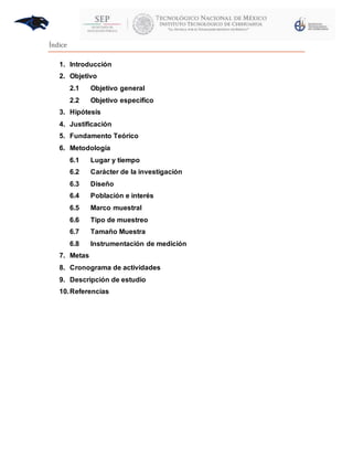 Este documento presenta un proyecto de investigación realizado por un grupo de estudiantes del Instituto Tecnológico de Chihuahua sobre el desarrollo de puertas giratorias que generen energía eléctrica a partir del movimiento de las personas. El objetivo principal es ahorrar energía y reducir el impacto ambiental. El proyecto describe la metodología, los objetivos específicos, la justificación, los fundamentos teóricos y el cronograma de actividades para llevar a cabo la investigación.