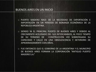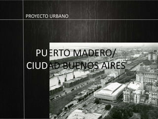 El proyecto urbano de Puerto Madero en Buenos Aires buscó revitalizar un área portuaria abandonada mediante tres etapas: 1) proteger el patrimonio histórico, reconstruir un muelle destruido y reconvertir edificios; 2) expandir el desarrollo inmobiliario hacia el este con proyectos de mayor altura; 3) gestionar el modelo a través de la Corporación Antiguo Puerto Madero con el objetivo de financiar el proyecto, recuperar el rol económico del área y acercar el río