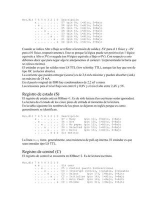 Este documento describe el puerto paralelo desde perspectivas de hardware y software. Desde el punto de vista del software, el puerto paralelo consiste en tres registros de 8 bits ubicados en direcciones de I/O consecutivas. Desde el punto de vista del hardware, el puerto es un conector DB25 con doce salidas y cinco entradas. El puerto se utiliza normalmente para transferir datos a una impresora a través de sus ocho líneas de datos y señales de control.