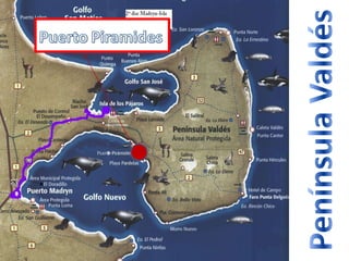Este documento proporciona información sobre la historia y el desarrollo de Puerto Pirámides, Argentina. Comenzó como un fuerte español en 1779 para proteger la región de los piratas, luego se convirtió en un puerto para la exportación de sal en 1900, y ahora depende principalmente del turismo para avistar ballenas y disfrutar de la naturaleza, como la Reserva Península Valdés.